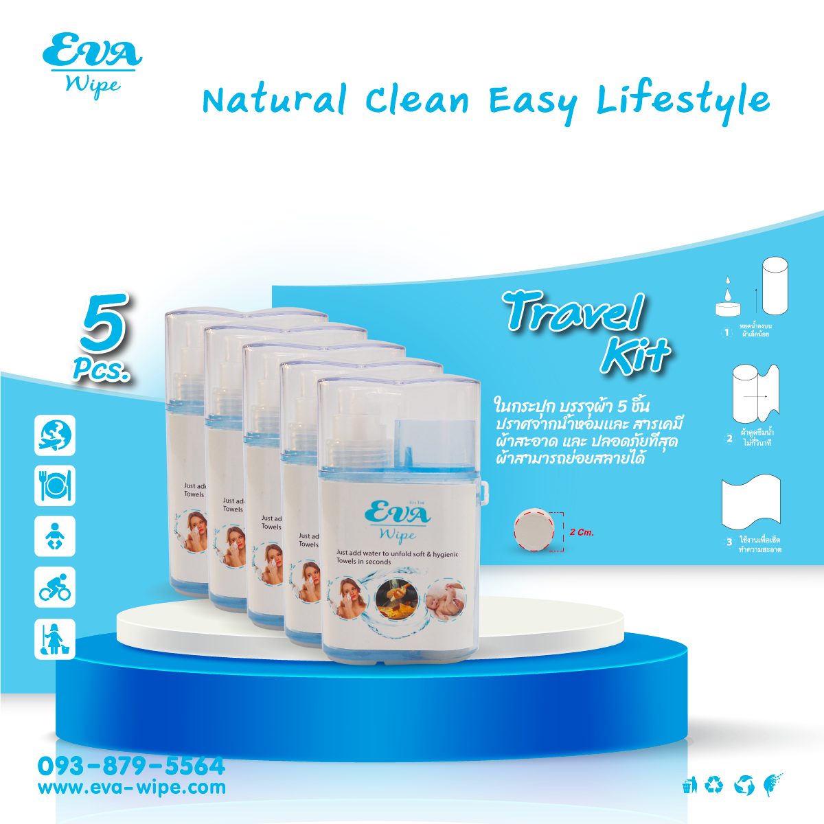 สามารถบรรจุ น้ำและผ้าอัดเม็ด 5 เม็ด/กระปุก